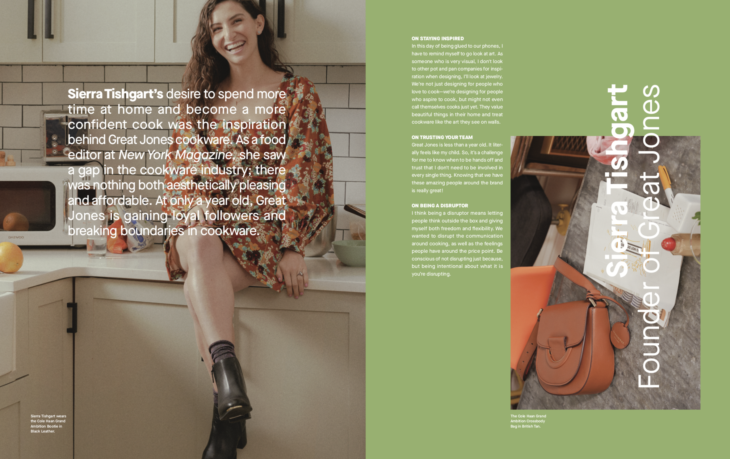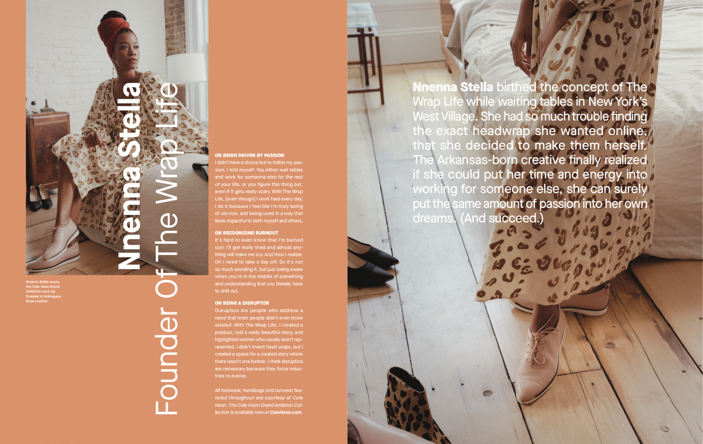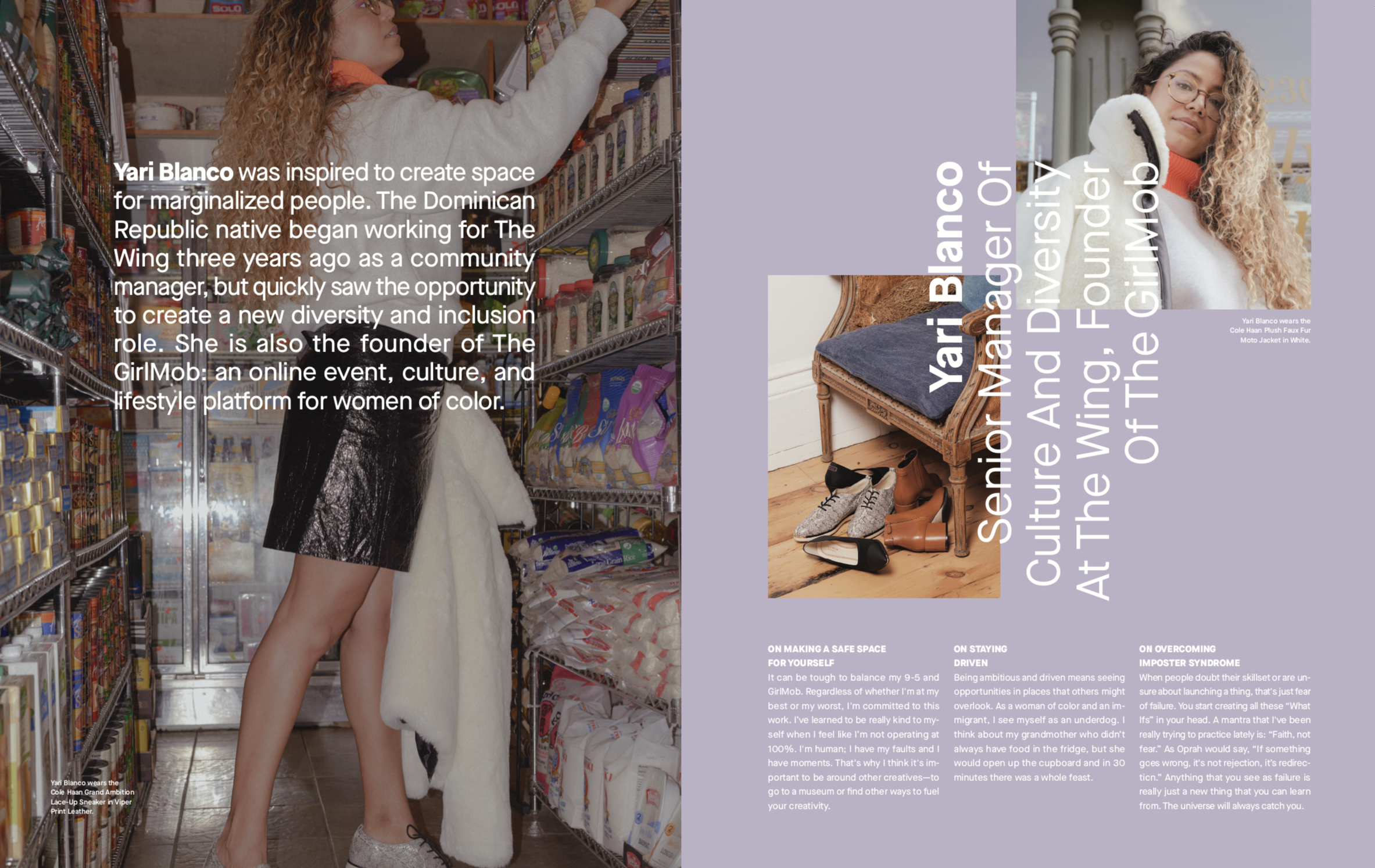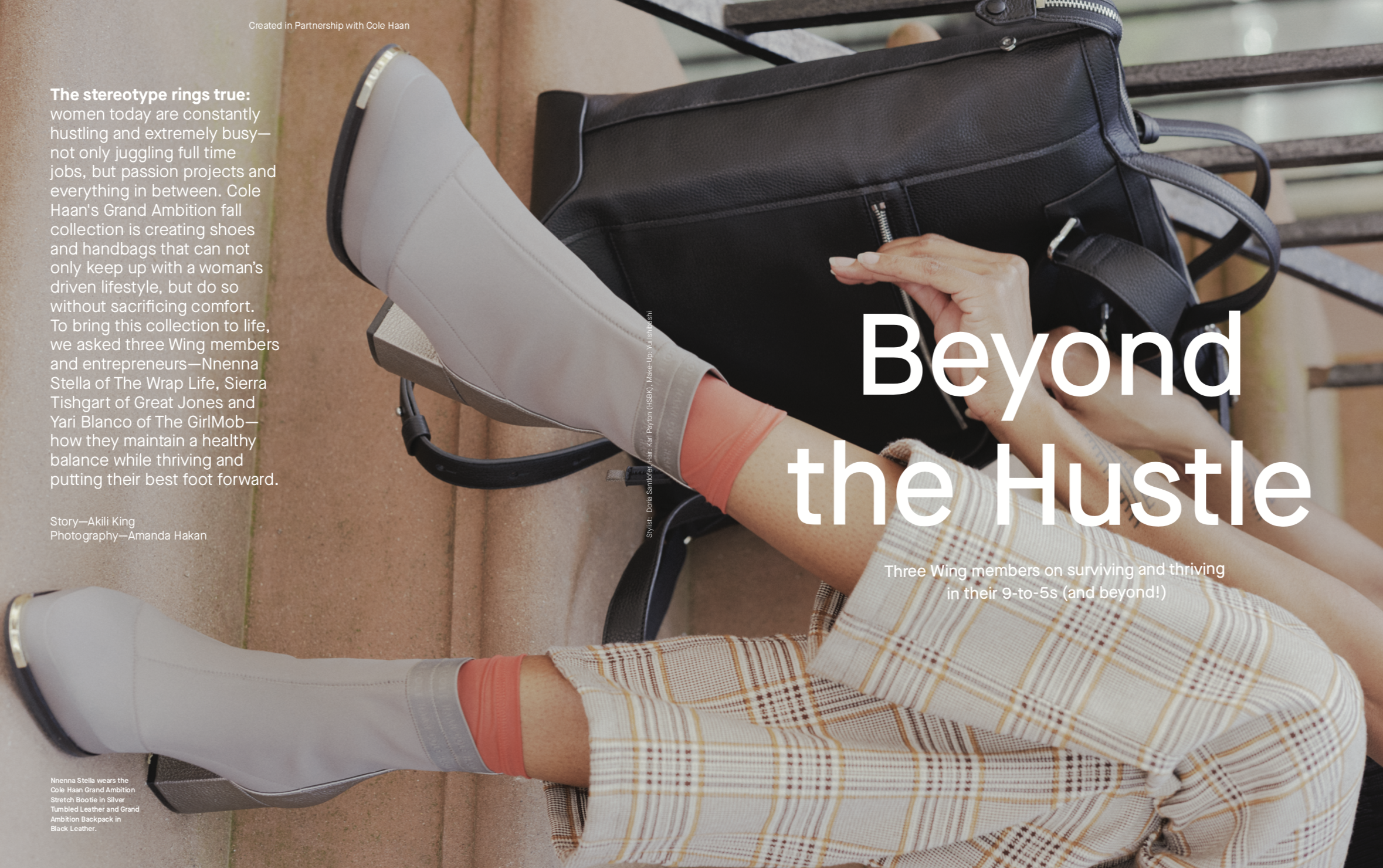 We produced a 10-page fashion editorial in The Wing’s No Mans Land print magazine. In our feature, we spotlighted our 3 extraordinary Wing women outfitted in Cole Haan’s Grand Ambition collection. Each entrepreneur shared their story on how they reinvented their careers along with how they’ve managed their mental wellness.